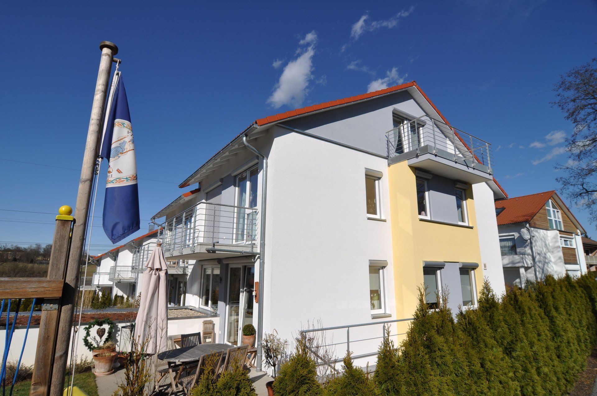 - Ausstattung mit Balkon im OG auf der Westseite, Erker mit Dachbalkon an den Außenhäusern, 2-3 Bäder.