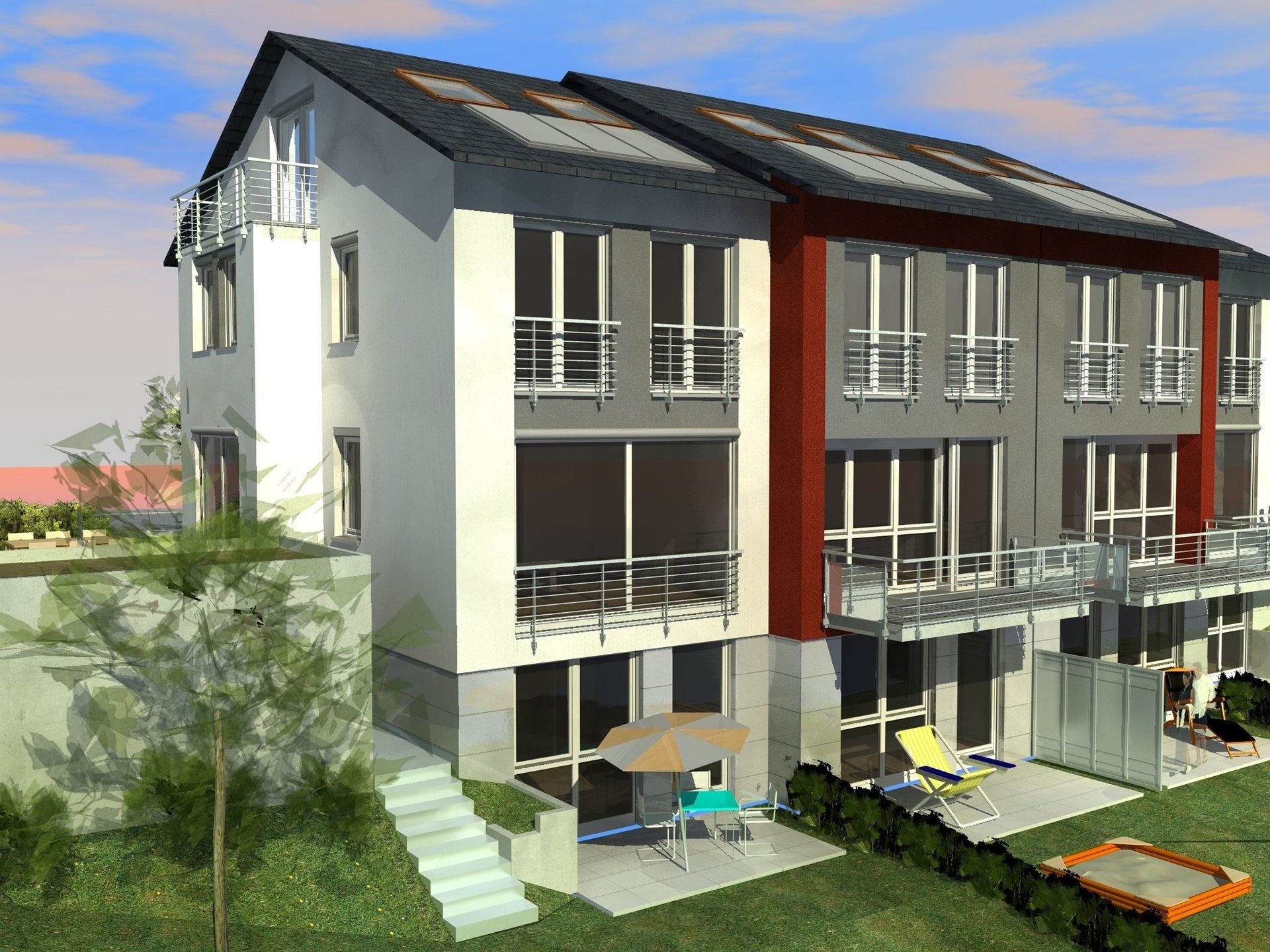 - Durch Balkone, Terrassen im EG und im Gartengeschoss und Dachterrassen bei den Außenhäusern, sowie große